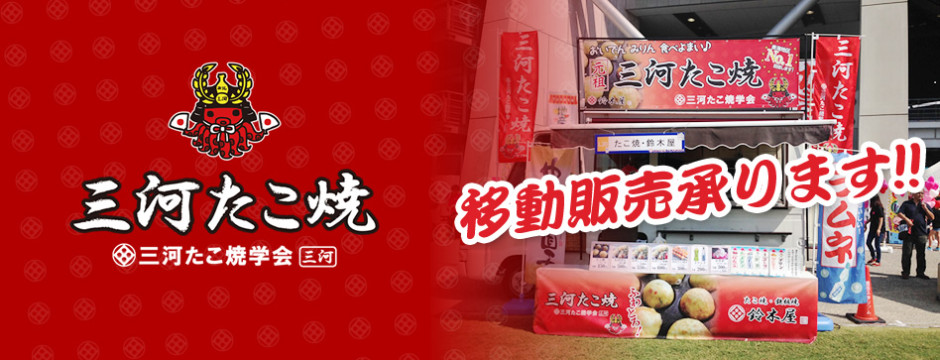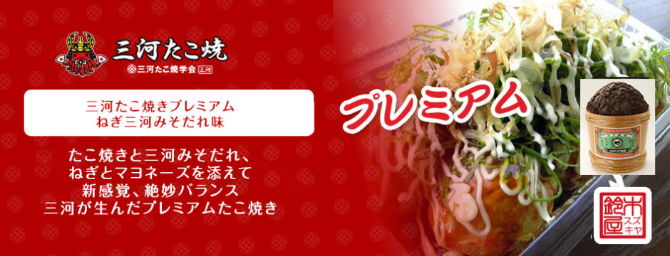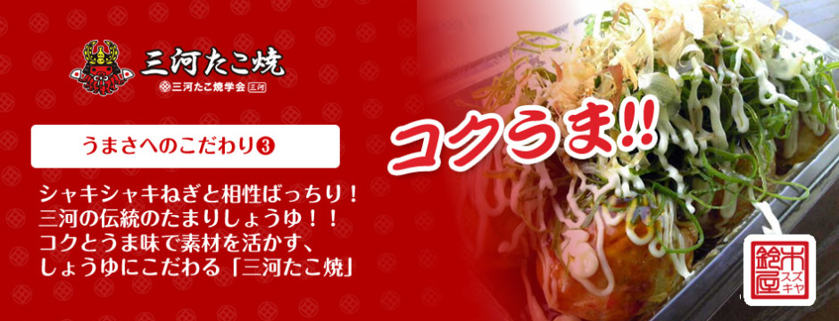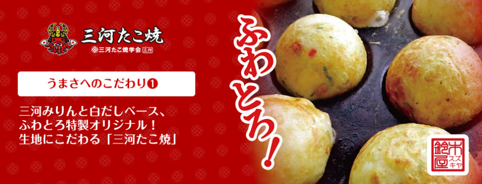 「三河たこ焼」:王道ソース、三河たまりしょうゆ(三河名産)、豊田足助塩(豊田名産)、ねぎたまりしょうゆ、明太チーズ、ねぎぽん酢、6種類の味が楽しめます。